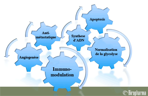 Il renforce l'effet de plusieurs médicaments chimiothérapiques et immunothérapiques. Avemar bloque l'enzyme RR et affaiblit ainsi la réplication d'ADN dans les cellules tumorales qui deviennent ainsi d'excellentes cibles pour la chimiothérapie.